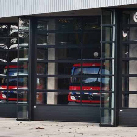 ITB-Falttore aus Stahl oder Aluminium haben ein formschönes, zeitloses Tordesign. Die markante Aufgliederung der Torflächen durch senkrechte schwarze Gummiprofile zwischen den Flügeln und optisch unaufdringlich angeordnete Beschläge prägen das Erscheinungsbild. Geschraubte Spezialscharniere gewährleisten ein geräuschloses und leichtes Öffnen und Schließen des Falttores auf Dauer. Die Konstruktion des gesamten Falttores ist elegant, robust und wartungsarm. Für Feuerwehr-Toranlagen können automatische Federöffnungseinrichtungen geliefert werden.